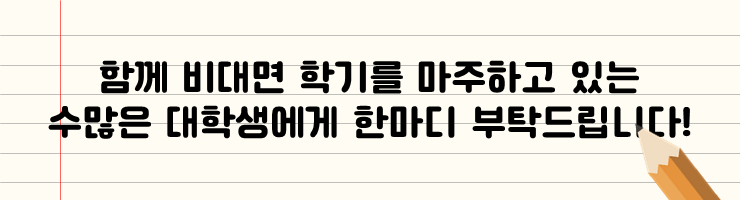 지금까지 과탑 공대생의 공부 방법 잘 알아보셨나요? 비대면이라는 위기를 기회로 삼아 만족스러운 성적을 거두시길 바랍니다. 이번 학기, 과탑 자리는 이 글을 읽은 당신의 것!