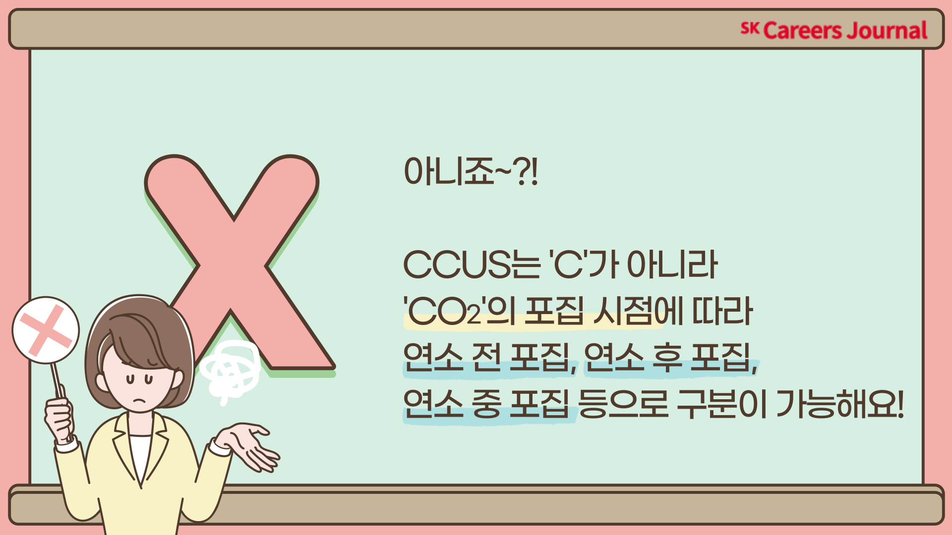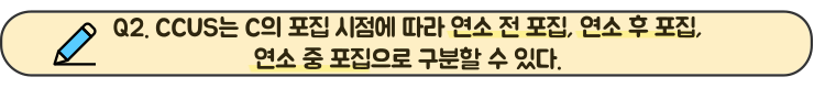 CCUS는 ‘C’가 아니라 ‘CO2’의 포집 시점에 따라 연소 전 포집, 연소 후 포집, 연소 중 포집 등으로 구분이 가능합니다. CCUS의 핵심 과정이 CO2 포집이라는 사실을 인지하면 ‘CO2’를 ‘C’로 헷갈릴 일은 없겠죠?!