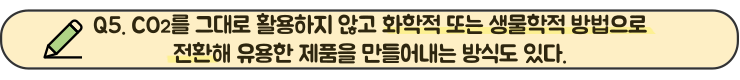 CO2를 그대로 활용하지 않고 화학적 또는 생물학적 방법으로 전환해 유용한 제품을 만들어내는 방식도 있어요~!