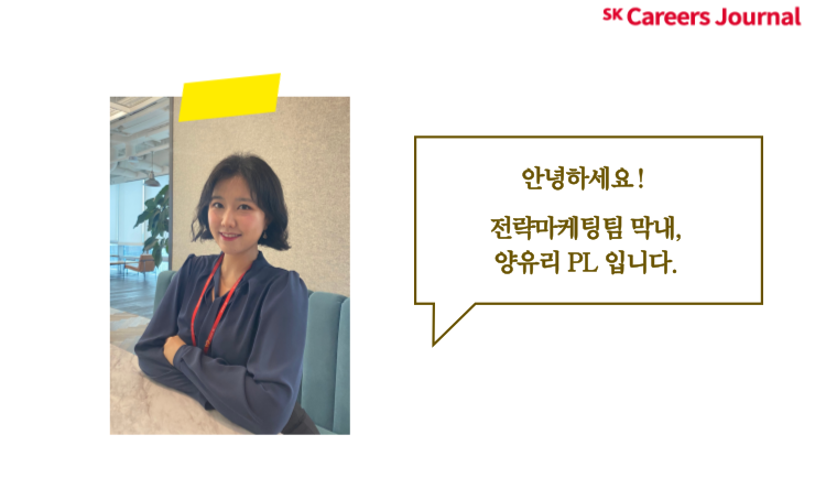 안녕하세요, SK머티리얼즈 전략마케팅팀 양유리PL입니다. 19년도에 SK머티리얼즈 공채 1기로 입사했고, 올해부터 전략마케팅팀에 합류해서 막내를 맡고 있습니다.
