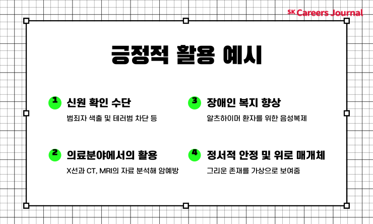 가짜와 진짜를 구분할 수 있는 뛰어난 능력으로 X선과 CT, MRI의 자료를 분석해 암의 징후 등을 찾아내는 등 의료분야에서도 큰 도움을 줄 수 있습니다.