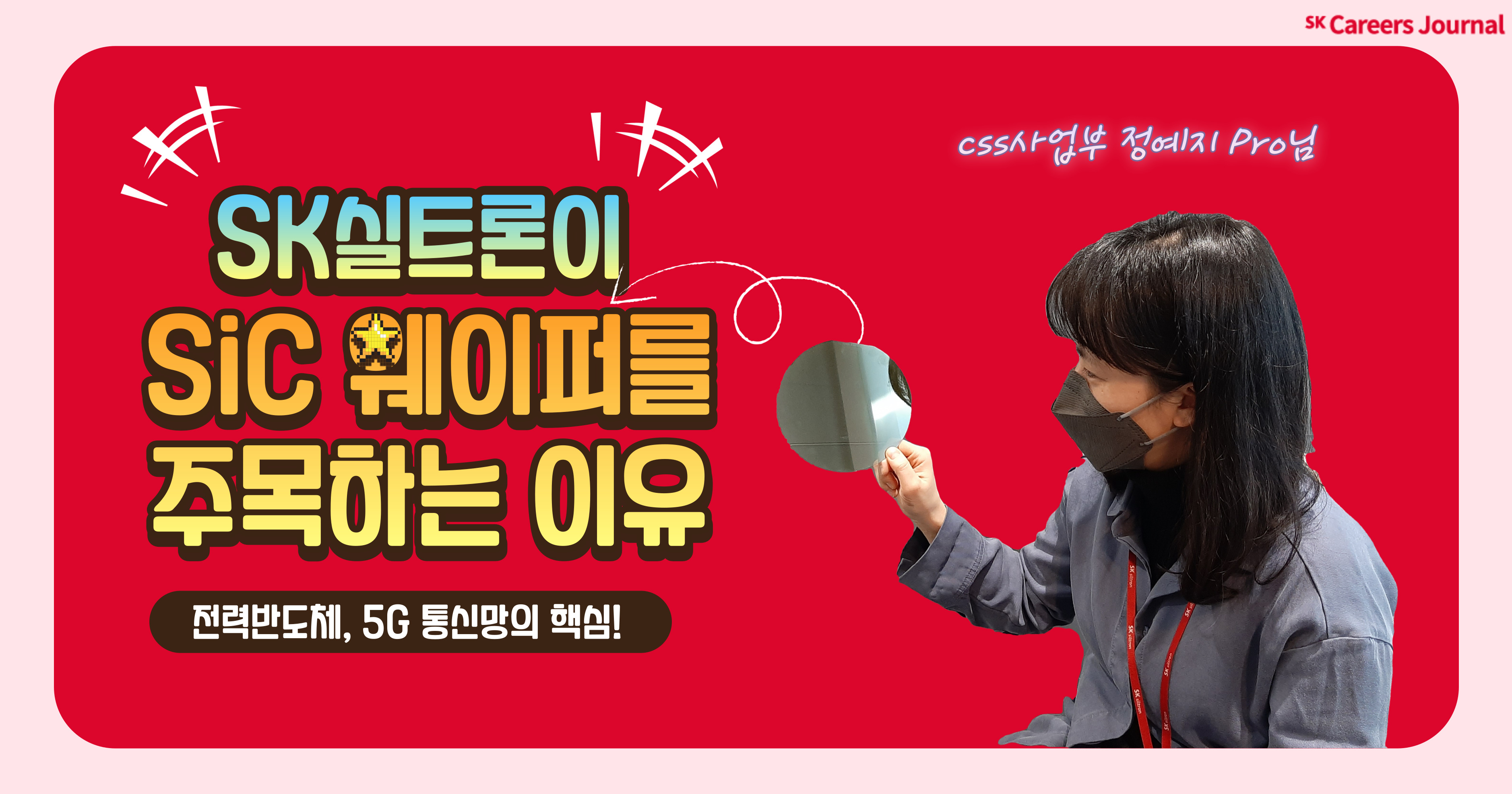 안녕하세요. 저는 SK실트론 CSS사업부 정예지 Pro입니다. SK실트론 CSS는 미국 듀폰의 SiC 웨이퍼 사업부를 인수하며 설립된 SK실트론의 미국 자회사입니다. 저는 SK실트론과 CSS 간 시너지를 낼 수 있도록 기획 및 관리하는 PMI* 역할을 수행하고 있습니다.