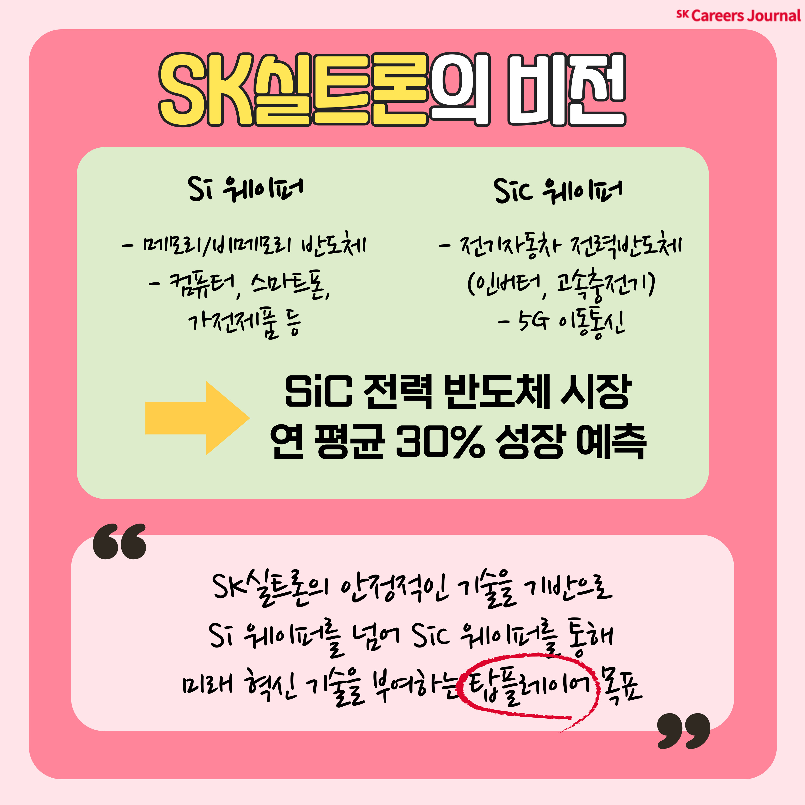 Si 웨이퍼를 넘어 SiC 웨이퍼까지 사업 영역을 확장한 SK실트론! Global 웨이퍼 업계 Top Tier로 성장할 SK실트론의 미래를 함께 할 예비 Pro님들의 많은 관심과 지원 부탁 드립니다~!