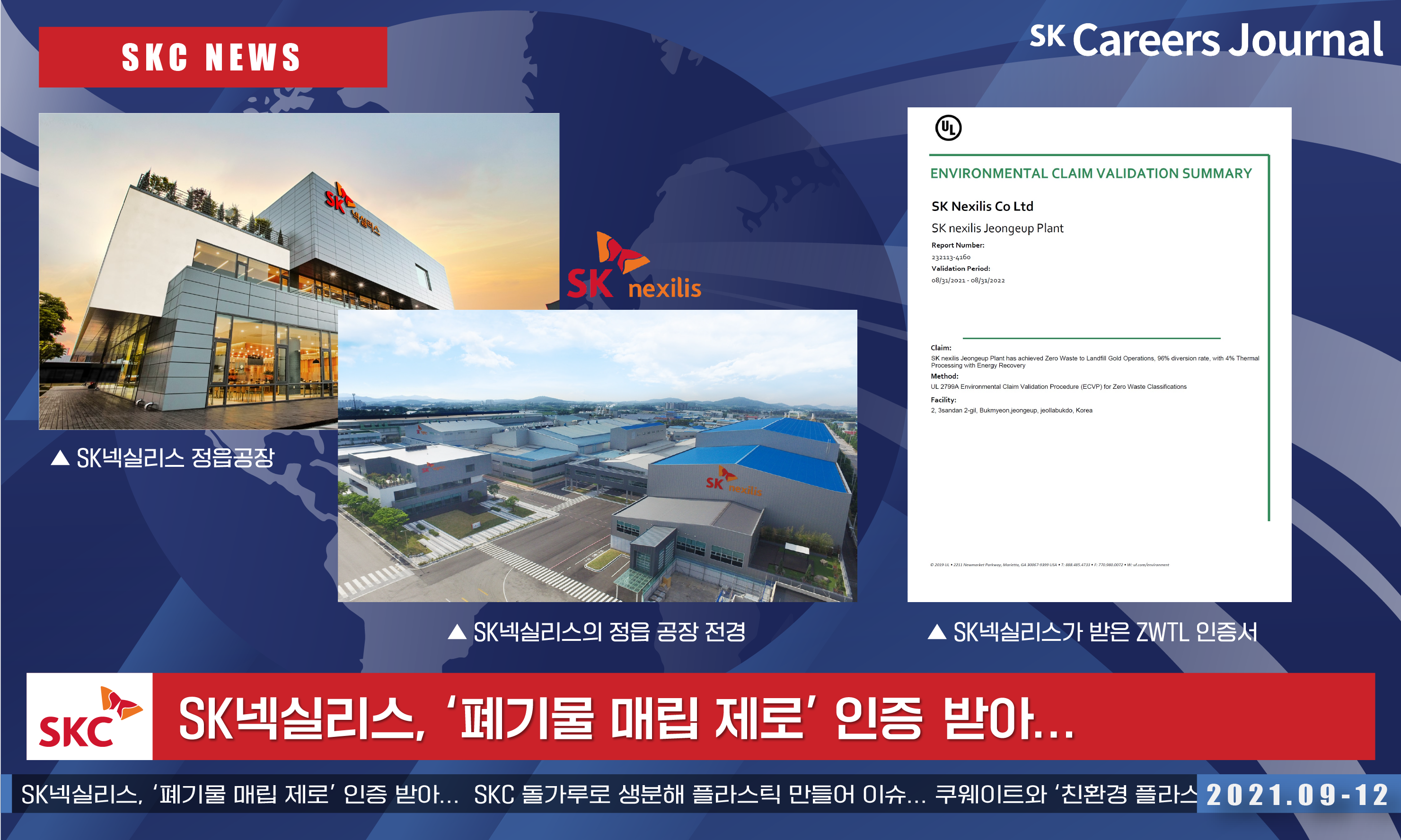 먼저 지난 2021년 9월 7일, SKC의 동박 사업 투자사인 SK넥실리스의 정읍공장이 국내 2차전지 관련 업계 최초로! ‘폐기물 매립 제로’ 골드(Gold) 인증을 획득한 소식입니다. SK넥실리스는 SKC 투자사 탐구 2탄으로도 소개해드렸던 2차전지용 동박 생산 기업인데요. 주요 생산지가 바로 정읍공장이었죠? 관련 업계 최초로 인증을 받다니 글로벌 No.1 기술력에 더해 친환경 생산공정까지 보유한 회사입니다.