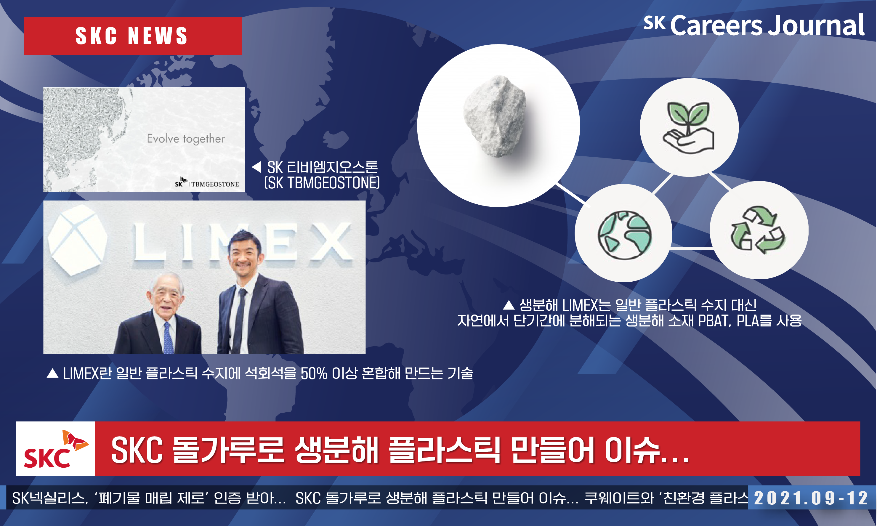 SKC는 일본 친환경 소재 기업 TBM과 합작사인 ‘SK티비엠지오스톤(SK TBMGEOSTONE)’을 설립해 썩지 않는 플라스틱의 사용량을 획기적으로 줄일 수 있는 ‘생분해 LIMEX’ 소재 기술의 개발 및 상용화에 착수했는데요. LIMEX란 일본 친환경 소재 기업 TBM의 기술로 일반 플라스틱 수지에 석회석을 50% 이상 혼합해 만드는 것입니다. 한 단계 더 나아간 ‘생분해 LIMEX’는 일반 플라스틱 수지 대신 자연에서 단기간에 분해되는 생분해 소재 PBAT, PLA를 사용해 친환경적인 면을 디벨롭시킨 것이에요.
