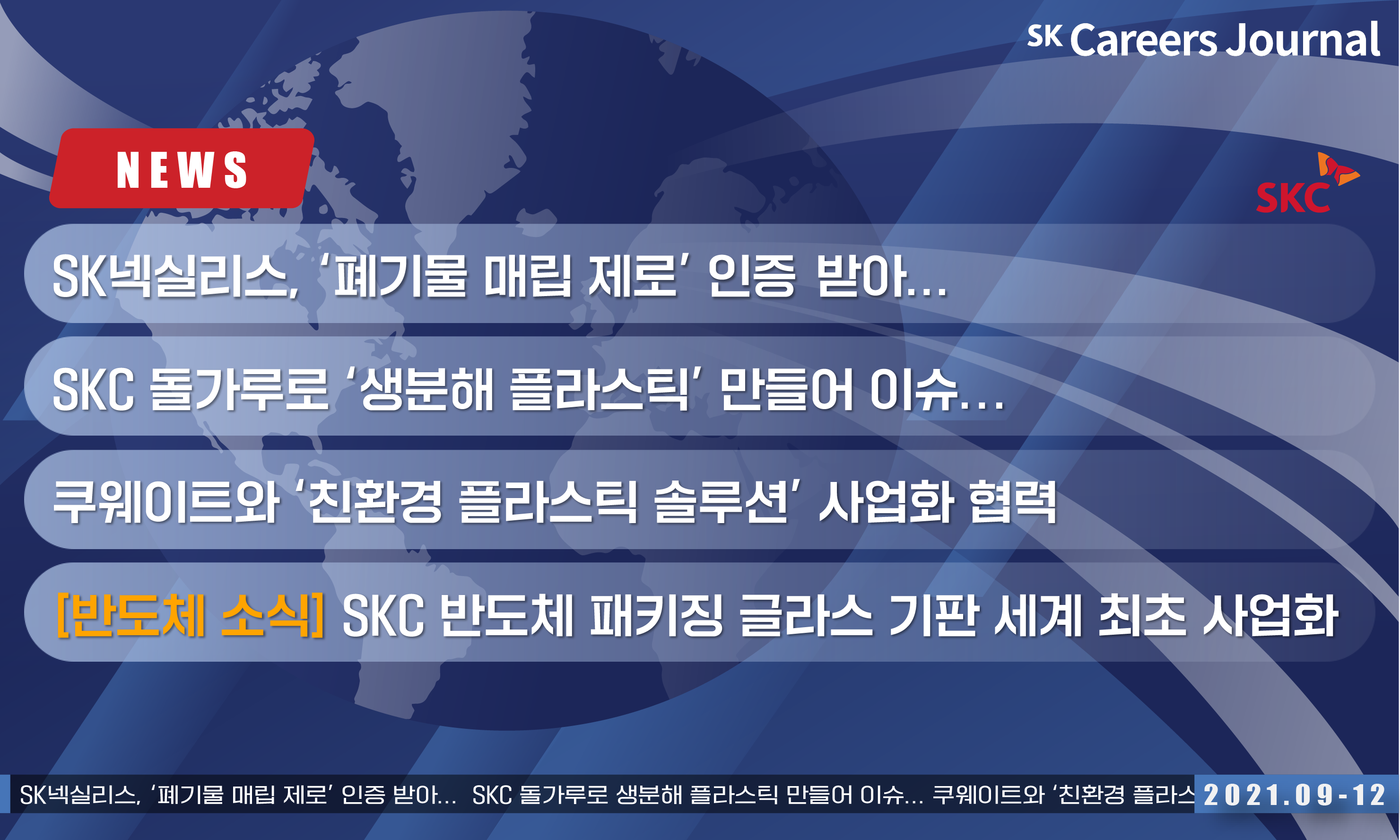 지금까지 SKC의 2021년 하반기 핵심 소식 4가지를 만나봤는데요. 대표 키워드인 ‘모.반.친’ 중 반, 친인 반도체와 친환경적 면모를 갖춘 SKC를 확인해볼 수 있었습니다. 다양한 국가의 기업들과 함께하는 폐플라스틱 관련 사업부터 새로운 기술의 사업화까지, 모두 어떠셨나요? 위와 같은 소식들이 SKC의 성장 가능성과 혁신의 방향성을 보여주는 것이라는 생각이 듭니다.