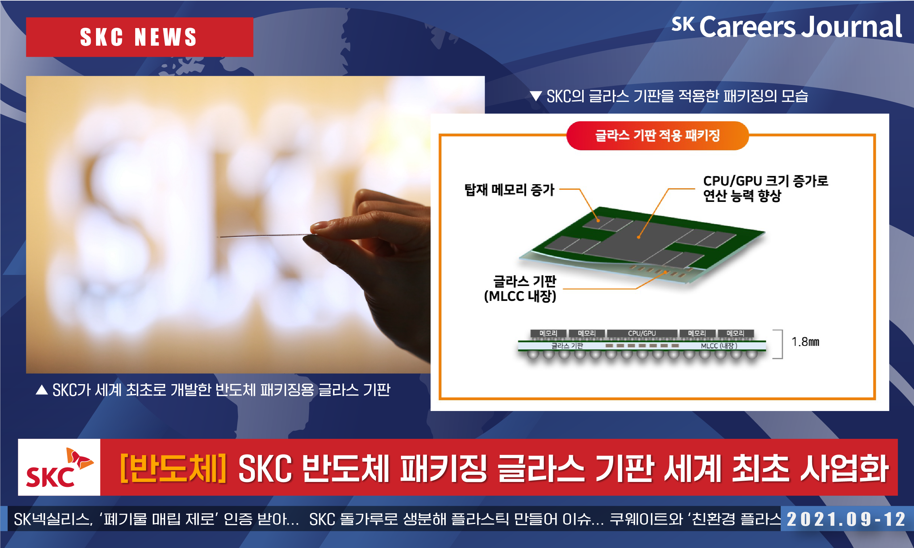 마지막 소식은 SKC가 반도체 패키징용 글라스 기판을 세계 최초로 사업화한다는 뉴스입니다. 조만간 SKC 문과 취업 시리즈 3탄인 기술사업화팀에 대한 기사가 발행될텐데요. 기술사업화팀이 최근 반도체 관련 기술을 사업화하는 과정 중에 있다고 밝혔었는데 바로 이것이었네요.