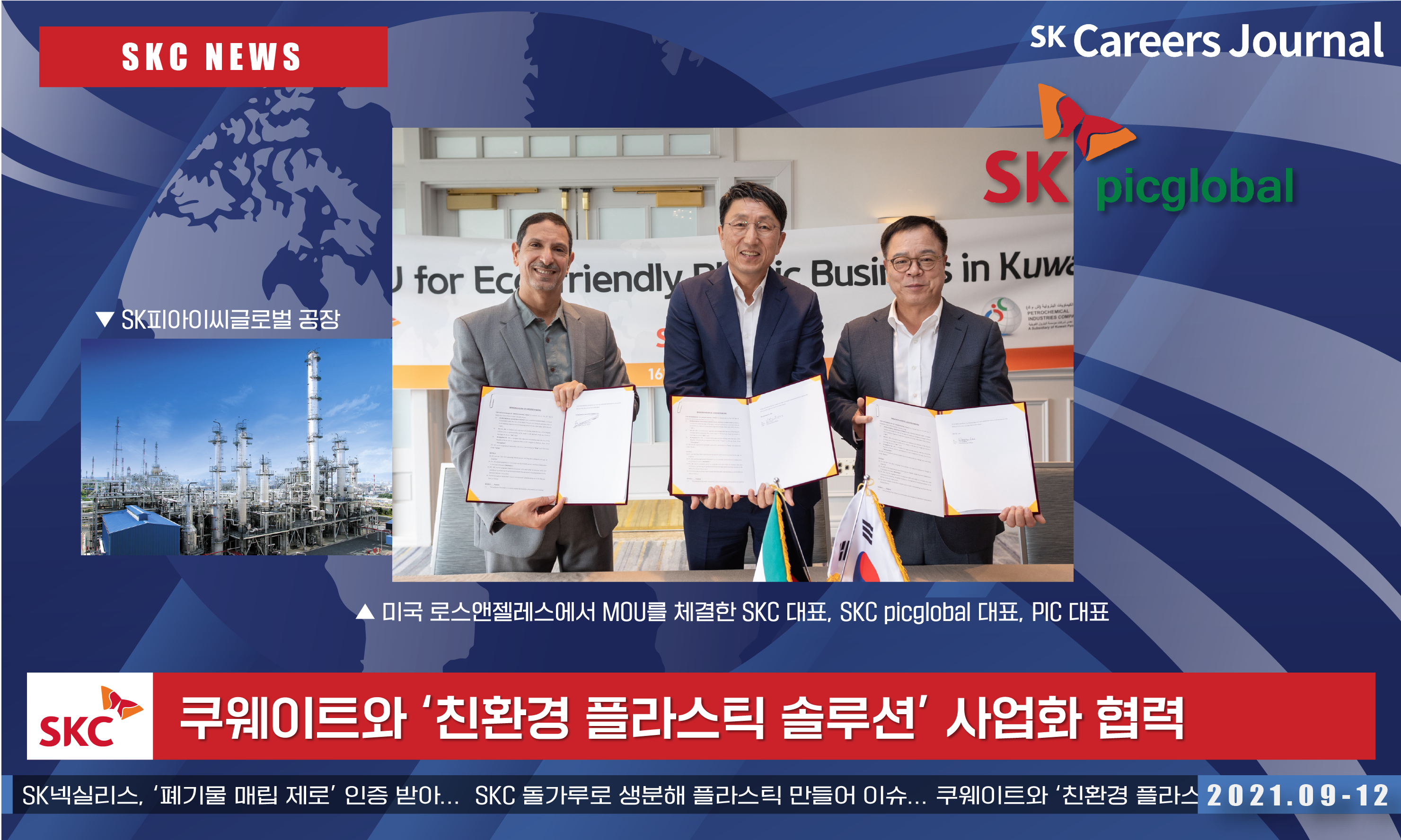 SKC가 쿠웨이트 최대 석유화학 기업인 PIC와 협력해 친환경 플라스틱 사업을 쿠웨이트로 확장하는 방안을 추진합니다. 미국 로스앤젤레스에서 쿠웨이트 내 친환경 플라스틱 사업 협력에 대한 MOU를 체결했다고 하는데요. PIC는 SKC 투자사인 SK picglobal의 합작 파트너이기도 합니다. (SK picglobal에 대한 소개 기사도 곧 발행될 예정이니 기대해주세요😊)