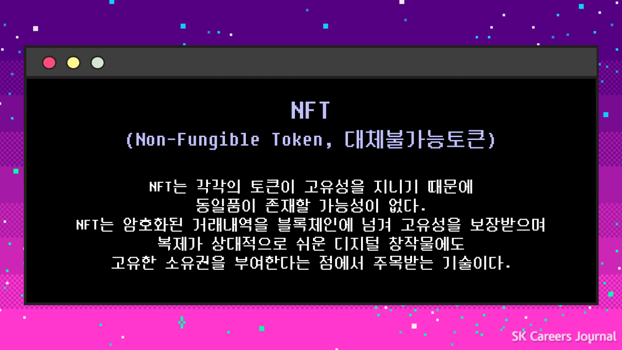 요즘 핫한 NFT(Non-Fungible Token, 대체불가능토큰) 마켓플레이스의 기반 기술이 블록체인입니다. NFT는 사진, 비디오, 오디오 및 기타 유형의 디지털 파일에 대한 소유권을 증명해 주고 있으며 디지털 아트 큐레이션(Klip Drops), 게이밍(Axie Infinity), 아바타플랫폼(제페토) 등에 사용되고 있으며 메타버스(SK 이프랜드, 디센트럴랜드) 에서도 활용되고 있습니다.