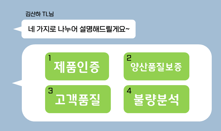 크게 제품인증, 양산품질보증, 고객품질, 불량분석 네 가지로 나누어 품질보증 직무를 설명해드리겠습니다.