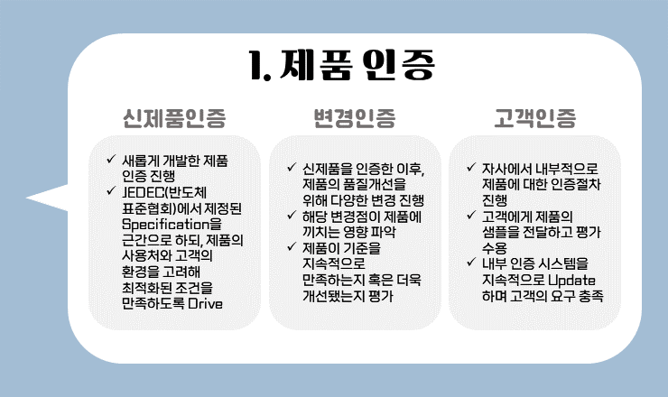 제품 인증은 크게 세 가지 업무로 구분할 수 있어요 제품 인증은 자사에서 개발한 제품이 양산 가능한 수준으로 개선되도록 Drive 하는 업무를 총괄하며 고객 단에서 발생할 수 있는 품질 Risk를 점검하고 선제적으로 개선하기 위해 신뢰성 평가를 진행합니다.