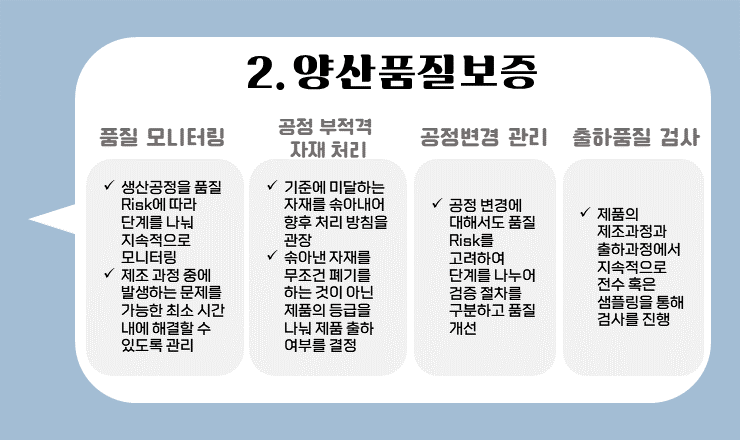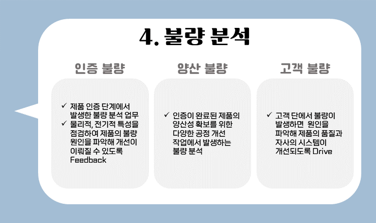 다음으로, 개발이 완료된 양산 제품에 대한 개선 업무를 총괄해요. 개발이 완료된 제품이 본격적으로 양산되기 시작하면 그 물량이 늘어나게 되면서 제품 인증 과정에서 파악하지 못했던 불량이 필연적으로 나타나기 때문에 품질보증은 정말 중요한 직무입니다.
