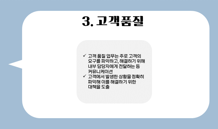다음으로 고객 품질 업무는 자사의 이익을 훼손하지 않으면서 고객의 요구를 파악해 해결하는 업무를 총괄해요. 따라서 상대의 요구사항을 신속, 정확하게 파악하고, 이를 내부 담당자에게 다시 전달해야 하므로 커뮤니케이션 능력이 필요해요. 또한 고객의 요청을 해결하는 과정에서 고객 품질 담당자는 신속하게 해결하면서도 회사 내부의 이익을 훼손하지 않아야 해요. 자사의 기밀에 해당하는 정보에 대한 유출을 방지하면서 고객이 원하는 정보를 줘야 합니다.