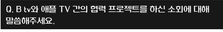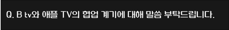 우선 개인적으로는 제가 애용하는 두 브랜드의 만남인데요ㅎㅎ 먼저 SK브로드밴드 입장에선 애플 제품에 대한 충성도가 높은 고객에게 Apple TV 4K의 장점을 내세워 B tv를 어필할 수 있습니다. 동시에 애플은 B tv를 통해 한국에 처음 출시하는 애플 TV+를 고객에게 소개할 수 있는 기회입니다. 이 만남을 많은 분들이 응원해 주셨으면 좋겠습니다!