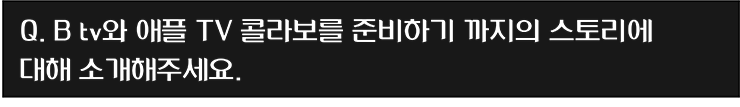SK브로드밴드와 Apple과의 성공적인 제휴는 SK브로드밴드 내 여러 유관 부서, Apple, 외부 업체까지 다양한 이들과의 협업을 통해 이뤄졌습니다. 출시 이후에도 Apple과 지속적으로 소통하며 고객들에게 도움을 주고자 노력하고 있습니다. 물론 준비과정이 녹록치 않기도 했습니다. 제휴 자체를 준비 초반부터 대내외비로 진행했기 때문에 SKB 내 유관부서, 외부 업체들과의 논의가 쉽지 않았습니다. 모든 제휴 관련 미팅은 “보안 유지 부탁드립니다”라는 말로 시작될 정도이기도 했습니다.
