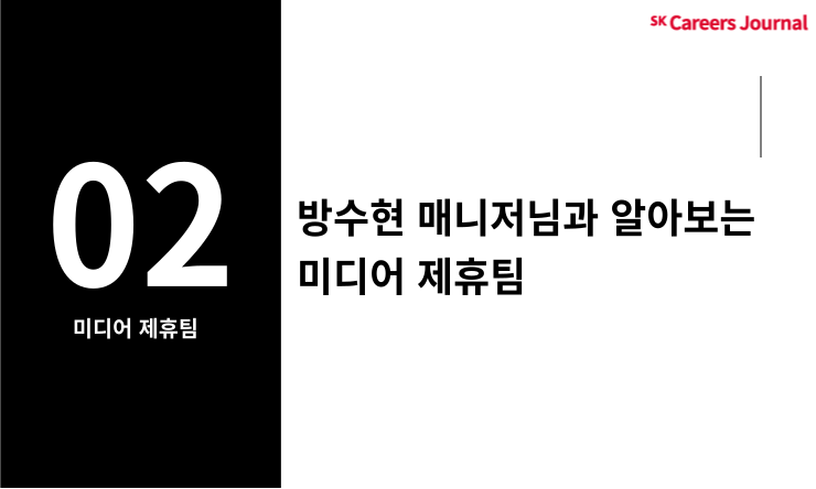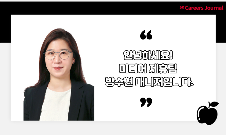 안녕하세요, 미디어제휴팀 방수현 매니저입니다. 2018년도에 경력직으로 SK브로드밴드 미디어 기획팀에 입사했습니다. 입사 후 B tv 미디어 관련 업무를 진행하던 중 애플 TV 프로젝트에 참여했습니다.