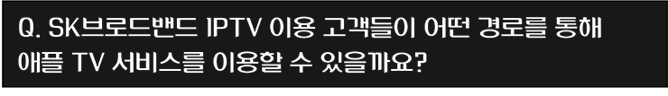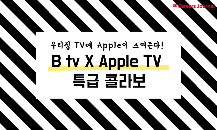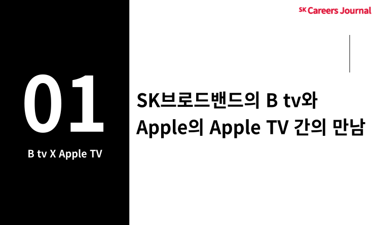 SK브로드밴드가 국내 미디어 시장에서의 또 다른 도약을 함께할 새로운 파트너를 만났습니다. 많은 이들의 이목을 집중시키고 있는 Apple TV(이하 애플 TV)입니다. SK브로드밴드가 국내 최초로 자사 IPTV 플랫폼인 B tv와 애플 TV를 통합해 B tv 기능뿐만 아니라 애플 TV의 각종 서비스를 제공하는 것인데요. 애플 TV의 다양한 콘텐츠, 미디어 스트리밍 기기 등을 선보이는 만큼 대중의 높은 관심도는 현재 진행형입니다. 방수현 매니저님과 함께 뜨거운 반응을 얻고 있는 애플 TV에 대해 자세히 알아보겠습니다! 매니저님께서 근무하고 계신 미디어 제휴팀에 대해서도 소개할 예정이니 기대해주세요! 그럼 지금부터 우리를 콘텐츠의 신세계로 이끌어줄 애플 TV 속으로 출발!