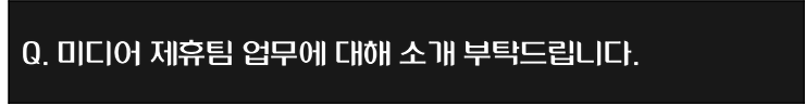미디어 제휴팀은 이번 애플 TV 서비스 프로젝트 등 다양한 협업 프로젝트를 총괄합니다. 다른 협력 기업과의 계약서 검토 및 협의부터 서비스 협의, 개발 follow up, 마케팅, 편성, 보도, 정책 등 모든 분야와 팀이 서로 유기적인 관계 속에서 연결되도록 관리합니다. 저는 미디어 제휴팀에서도 comm과 PM을 맡고 있습니다!