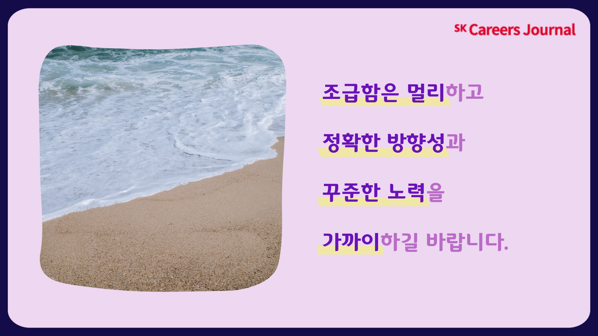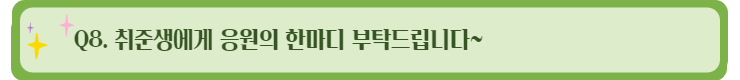취준생활은 보이지 않는 터널을 지나는 것과 같다고 생각합니다. 시간이 흘러도 끝이 보이지 않으면 ‘내가 다른 사람보다 뒤쳐진 것은 아닐까?’ 하고 부정적인 생각이 들기 마련입니다. 조급함은 멀리하고 정확한 방향성과 꾸준한 노력을 가까이하길 바랍니다. 2021년 마무리 잘 하시고 희망찬 2022년을 맞이하시길 바라겠습니다.