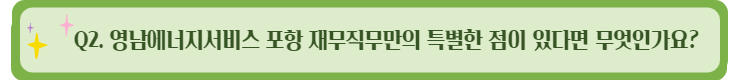 영남에너지서비스㈜ 포항의 재무직무만의 특별한 점으로 다양성을 말씀드릴 수 있을 것 같습니다.