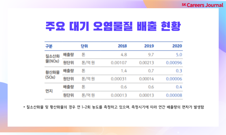 SK머티리얼즈는 물 또는 대기를 통해 배출되는 오염물질 관리를 단순히 준법의 차원을 넘어 환경적 책임을 이행하는 활동으로 이해하고 있는데요. 이에 엄격한 사내 관리 기준을 수립하여 법적 기준을 철저하게 준수하고 있으며, 주요 오염물질의 원단위 배출량을 지속적으로 감축하기 위해 노력하고 있습니다. 지금부터 각 오염물질 관리 방식에 대해 알아보도록 하겠습니다!