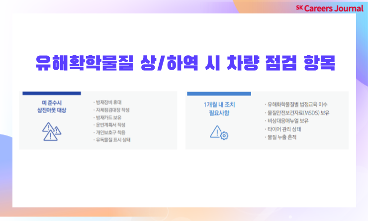 화학물질 차량 안전을 위해서는 수송업체를 대상으로 상·하역시 수송차량의 준수사항을 매번 점검하고 있으며 사내관리 기준에 따라 3회 이상 위반 시 사내 출입을 금지하는 삼진아웃 제도를 운영하여 수송업체와 운전자의 역량을 강화하고 있습니다. 또한, 수송차량의 타이어 관리 상태 미흡 등의 시정조치가 발견될 경우 1개월 내 조치를 취할 수 있도록 안내하며, 운전자에게 유해물질에 대한 안전의식을 고취시키고 있습니다.