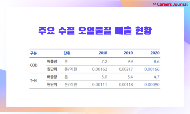 SK머티리얼즈는 생산활동으로 인한 수질 오염물질의 배출을 최소화하기 위해 법적 규제보다 엄격한 사내 관리규정을 두어 운영하고 있습니다. 이에 따라 주로 배출되는 오염물질인 COD(Chemical Oxygen Demand, 화학적 산소 요구량), T-N(Total Nitrogen, 총 질소) 등을 물환경보전법상 배출 허용기준의 80% 이하로 관리하고 있습니다.