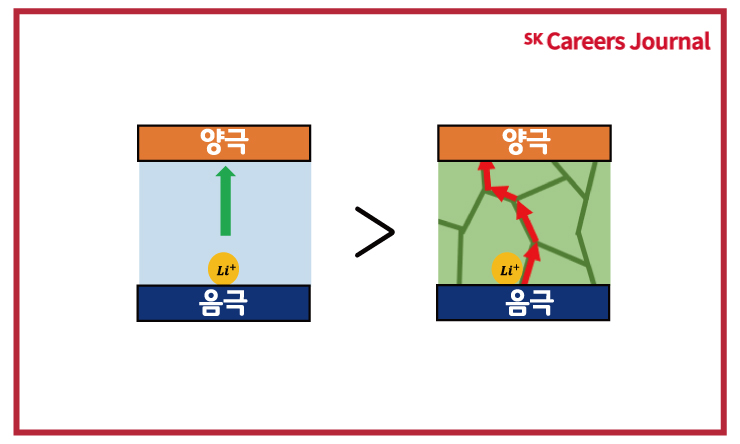 바로 성능이 좋지 않기 때문입니다. 액체 전해질의 경우 리튬 이온이 상대적으로 자유롭게 움직일 수 있어, 리튬 이온의 유동성이 매우 좋은 편이라고 할 수 있지만, 고체 전해질의 경우 리튬 이온의 움직임이 상대적으로 자유롭지 못해, 많은 제약을 받는다고 할 수 있습니다. 좀 더 자세히 설명하자면 고체 전해질의 경우 리튬 이온이 결정 격자 사이로만 이동할 수 있기 때문에 성능이 떨어진다고 할 수 있는데요! 이는 실제로 우리가 어떠한 물질을 물에 떨어뜨렸을 때와 고체에 떨어뜨렸을 때를 생각해봐도 쉽게 이해할 수 있습니다. 위에서 설명한 것처럼 안정성과 고 에너지 밀도화가 가능하다는 장점 때문에 고체전해질은 매우 유망한 이차 전지라고 할 수 있지만, 전해질의 가장 중요한 능력인 이온을 수송하는 능력이 액체전해질보다 떨어져 아직 상용화에는 많은 어려움이 있습니다. 따라서 실제로 이온을 수송하는 능력인 이온전도도를 향상시키기 위해 많은 연구가 진행 중에 있는데요! 이러한 한계점을 극복할 수 있다면, 배터리 사고가 일어나지 않는 사회를 기대할 수 있지 않을까요?