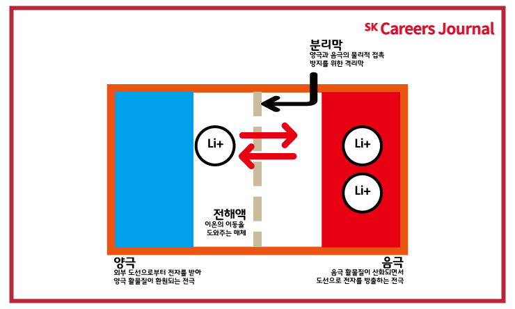 우선, 가장 많이 사용되고 있는 리튬이온 배터리의 구조를 살펴볼까요? 리튬이온 배터리는 양극과 음극, 전해액, 분리막으로 구성되어 있습니다. 양극은 상대적으로 큰 전압을, 음극은 상대적으로 작은 전압을 가지고 있는데, 이 전압의 차이를 이용하여 전류를 생산하는 원리입니다! 좀 더 풀어서 설명하자면, 각 극은 에너지 차이가 존재하고 리튬 이온들이 충/방전 과정에 따라 각 극을 이동하면서 거기에 상응하는 전류(에너지 차이)를 생산한다고 생각하시면 될 것 같습니다. 그렇다면 리튬 이온들은 어떻게 각 극을 이동할 수 있을까요? 바로 전해액을 통해서 이동할 수 있습니다! 전해액은 리튬 이온의 수송을 돕는 역할을 하는 물질인데요! 리튬 이온이 이동할 수 있게 다리역할을 해준다고 생각하시면 될 것 같습니다. 다리역할을 하는 전해액이 튼튼하고, 리튬 이온이 이동하는 과정에 있어서 장애물들이 없다면 더 빨리 이동할 수 있다고 유추할 수 있습니다. 하지만 사진을 봤을 때 분리막이라는 존재는 리튬 이온이 이동하는 경로에 있어서 장애물처럼 보이는데, 분리막은 무슨 역할을 할까요? 바로 양극과 음극이 물리적으로 접촉할 때 발생하는 전기적 단락, 쇼트를 방지하는 역할을 합니다. 다시 말해 분리막이 없다면 양극과 음극이 접촉하여 화재, 폭발이 발생할 수 있다는 뜻인데요! 하지만 화재가 일어나는 원인은 분리막 뿐만 아니라 전해액에도 존재하는데요! 그 이유에 대해서 지금 알아보도록 하겠습니다!