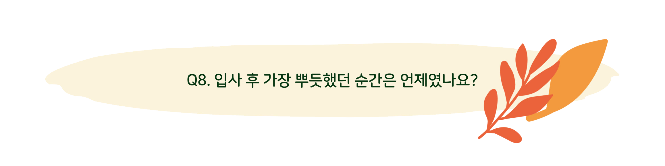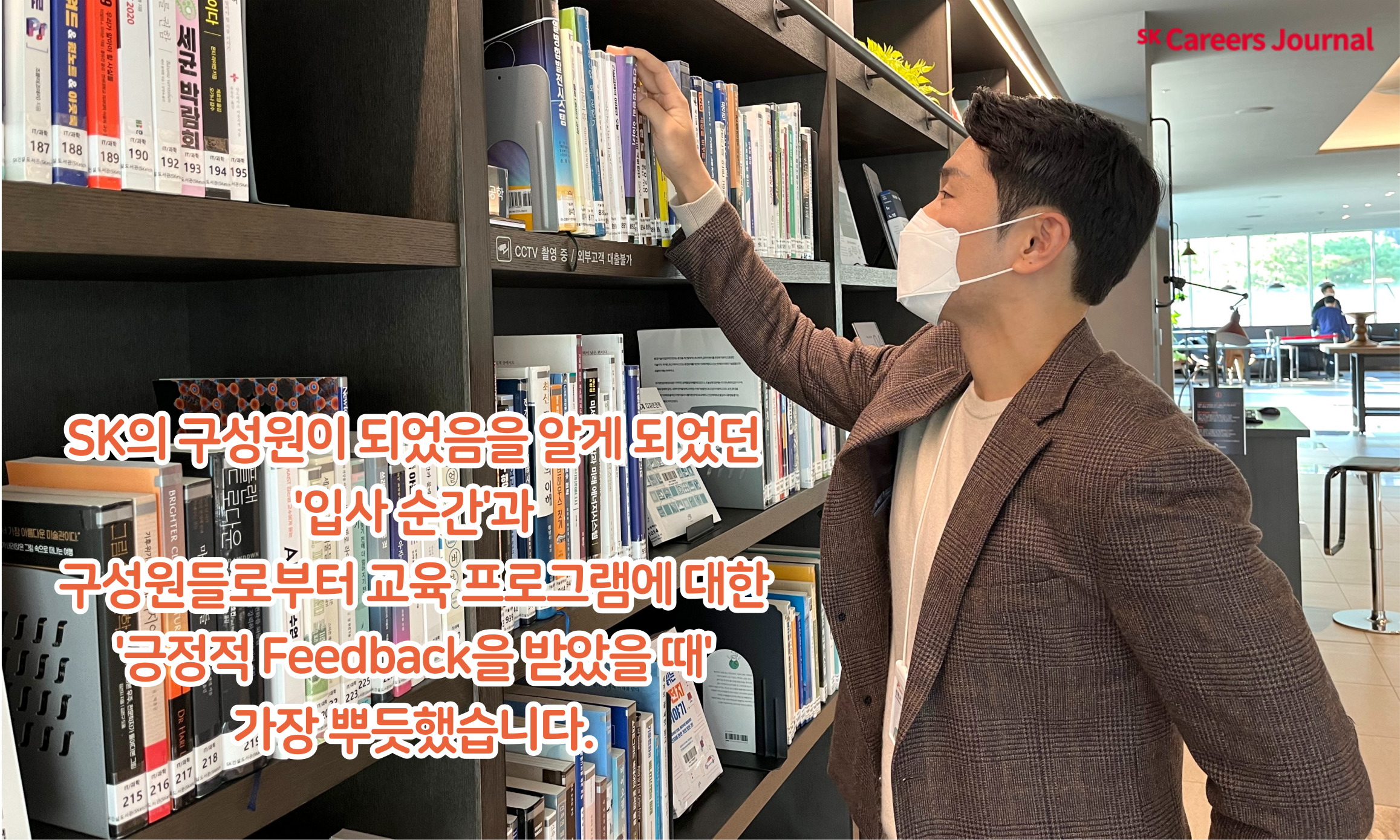 SK의 구성원이 되었음을 알게 되었던 ‘입사 순간’이 가장 뿌듯했던 것 같습니다. 업무 중에는 구성원들로부터 교육 프로그램에 대한 ‘긍정적 Feedback을 받았을 때’ 가장 기분이 좋았는데요, 특히 제가 기획한 교육이 구성원에게 도움이 되었고 그로 인해 역량이 향상되었다는 것을 알게 되었을 때 큰 보람을 느꼈던 것 같습니다.