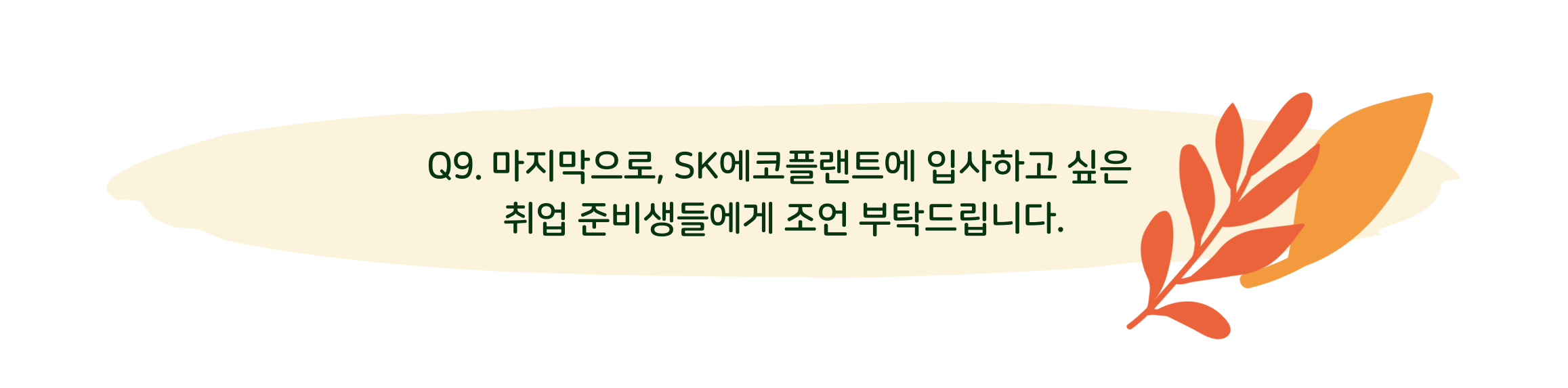 SK에코플랜트뿐 아니라, SK의 모든 관계사가 ESG/탈탄소 선도 기업으로 도약하기 위해 모든 역량을 집중하고 있습니다. 취업 준비생분들께서도 ESG와 친환경 사업에 대한 이해를 바탕으로 취업 준비를 하시면 많은 도움이 될 것 같습니다. 합격까지 조금만 더 힘내시고 꼭 SK에서 만나길 바라겠습니다!