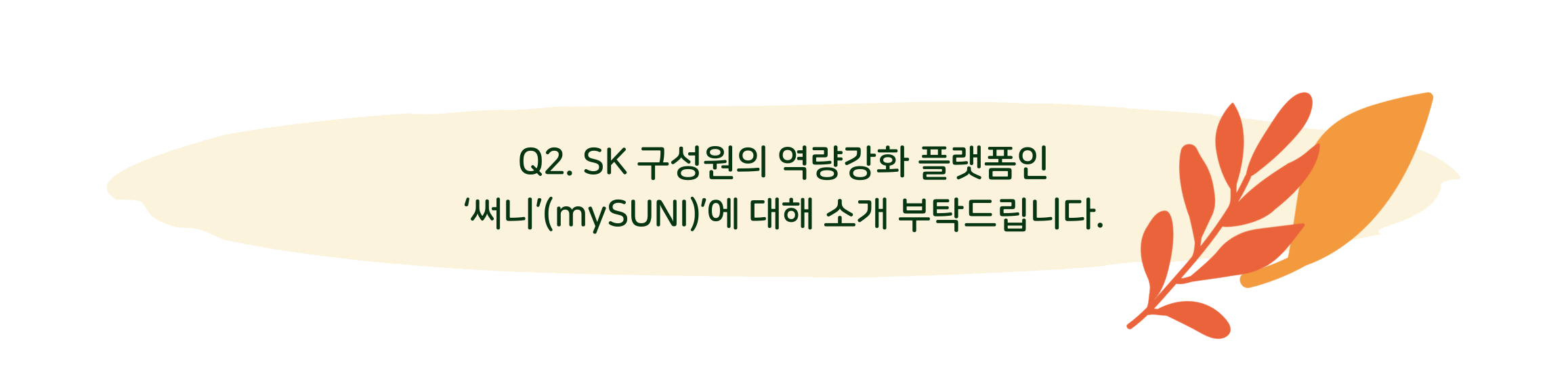 SK그룹 구성원의 역량 강화 플랫폼인 ‘써니’(mySUNI)’에 대해 알고 계시나요? 😊 써니는 급변하는 경영 환경에 맞춰 구성원들이 자기주도적 학습으로 미래 역량을 강화할 수 있도록 지난해 1월 AI, 행복, 사회적 가치 등 8개 분야로 출범했습니다. 이후 미래 반도체, 환경 및 비즈니스 모델 스토리텔링 등으로 영역을 확대하고 있는데요, 더 자세한 소식 전해드리기 위해 진현국 프로님과의 인터뷰를 진행하였습니다!