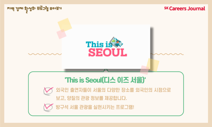 방구석 서울 관광을 실현시켜주는 디스 이즈 서울(This is Seoul)! 외국인 시청자, 나아가 한국인 시청자에게도 유익한 서울 관광 정보가 가득 담겨 있습니다. 또 관광 상권 활성화에도 도움을 주는 뜻깊은 프로그램이라고 생각합니다.
