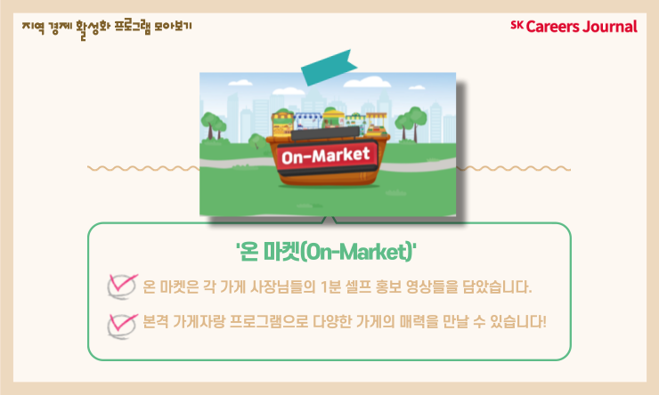 지역의 여러 가게를 한 프로그램에서 만나볼 수 있다! ‘1분’이라는 시간 동안 한 가게의 여러 정보를 속도감 있게 전달해 프로그램의 몰입도가 높다! 이처럼 온 마켓은 다양한 매력이 있는 프로그램입니다.