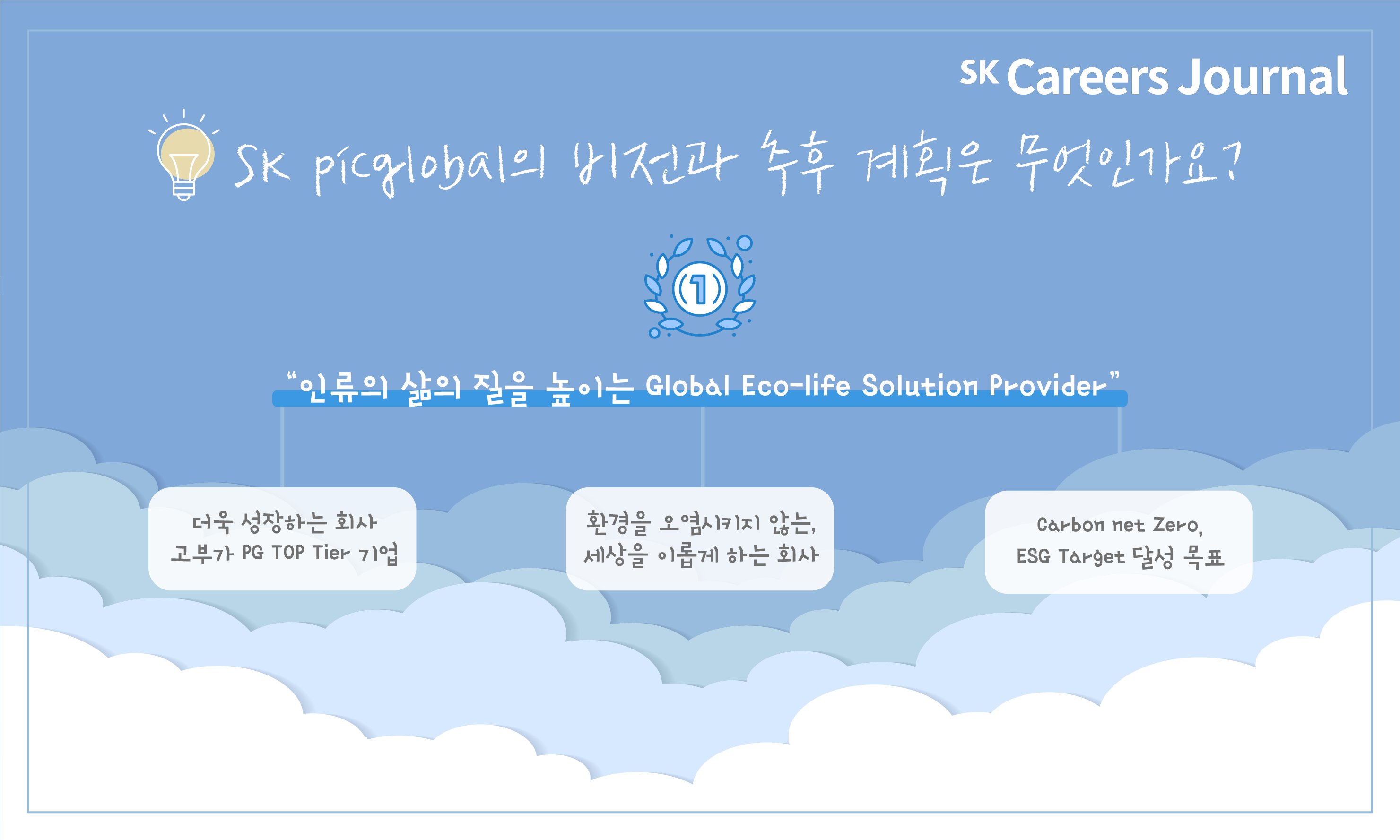 SK picglobal의 비전은 “인류의 삶의 질을 높이는 Global Eco-life Solution Provider”입니다. 이 비전을 달성하기 위하여 우리 회사는 첫째로 더욱 성장하는 회사가 될 것입니다. 고부가 PG Top Tier 회사로 성장하는 도약을 할 것입니다. 둘째로 ‘환경을 오염시키지 않는 회사, 세상을 이롭게 하는 회사’가 될 것입니다. Carbon net Zero, RE100 및 폐기물 Zero化 같은 ESG Target 달성을 하는 회사가 되는 것이 목표입니다.