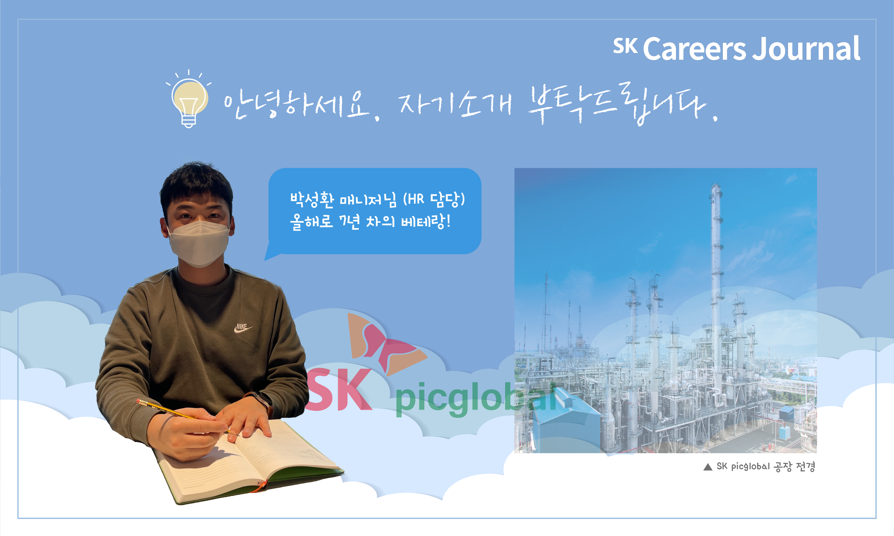 안녕하세요. SK picglobal에서 HR 업무를 담당하고 있는 박성환 매니저입니다. 입사한지 올해로 7년 차이며, SKC 울산공장에서부터 HR 업무를 담당해 왔었고, SKC 화학부문이 2020년 SK picglobal로 물적분할을 한 이후부터 본사에서 근무하고 있습니다.
