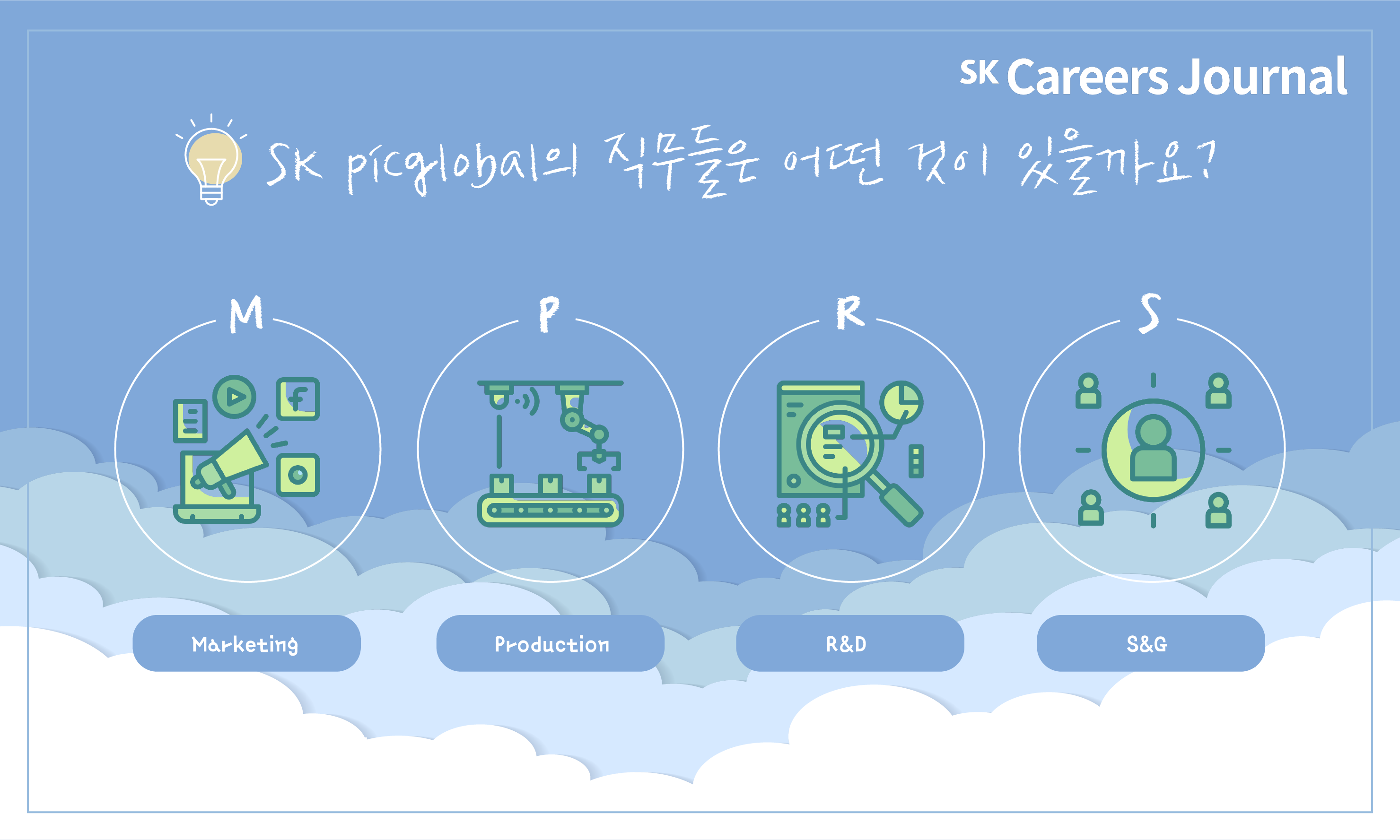 SK picglobal의 직무로는 M, P, R, S로 나눠볼 수가 있는데요. M은 Marketing으로 생산된 물품 판매를 책임지고 영업 전략을 세우는 곳입니다. 미래 먹거리를 책임지기 위해 성장 가능성이 있는 산업을 탐색하는 일도 포함합니다. P는 울산공장에서 PO와 PG를 생산하는 Production을 의미합니다. R은 R&D이구요. S는 S&G로 일반적인 인사, 구매, 총무, 회계, 재무 등을 책임지고 있습니다.