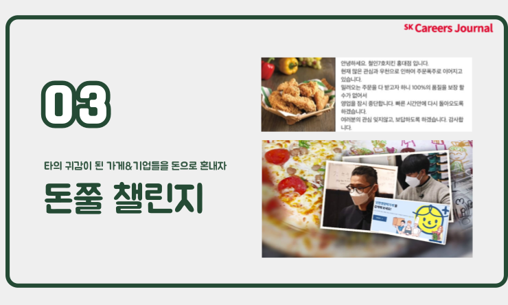‘돈’과 ‘혼쭐’이 합쳐진 신조어 ‘돈쭐’은 좋은 일로 타의 귀감이 된 가게, 기업의 제품을 구입해 돈으로 혼쭐을 내준다는 의미로 사용됩니다. 배고픈 형제에게 대가 없이 치킨을 내어주고 다시 찾은 동생의 덥수룩한 머리까지 잘라준 사실이 형의 자필 편지로 밝혀진 홍대 ‘철인 7호 치킨’은 전국각지의 국민들에게 단단히 돈쭐났었습니다. 매장을 직접 찾아 음식값에 후원금을 추가로 전달하는 손님이 있는가 하면, 타지역에서 배달 앱을 통해 결제하고 음식을 받지 않는 등 다양한 형태로 응원과 지지를 받았습니다. 그 외에도 좋은 가게와 기업에게 돈쭐을 냈던 많은 사례들을 쉽게 접할 수 있습니다.