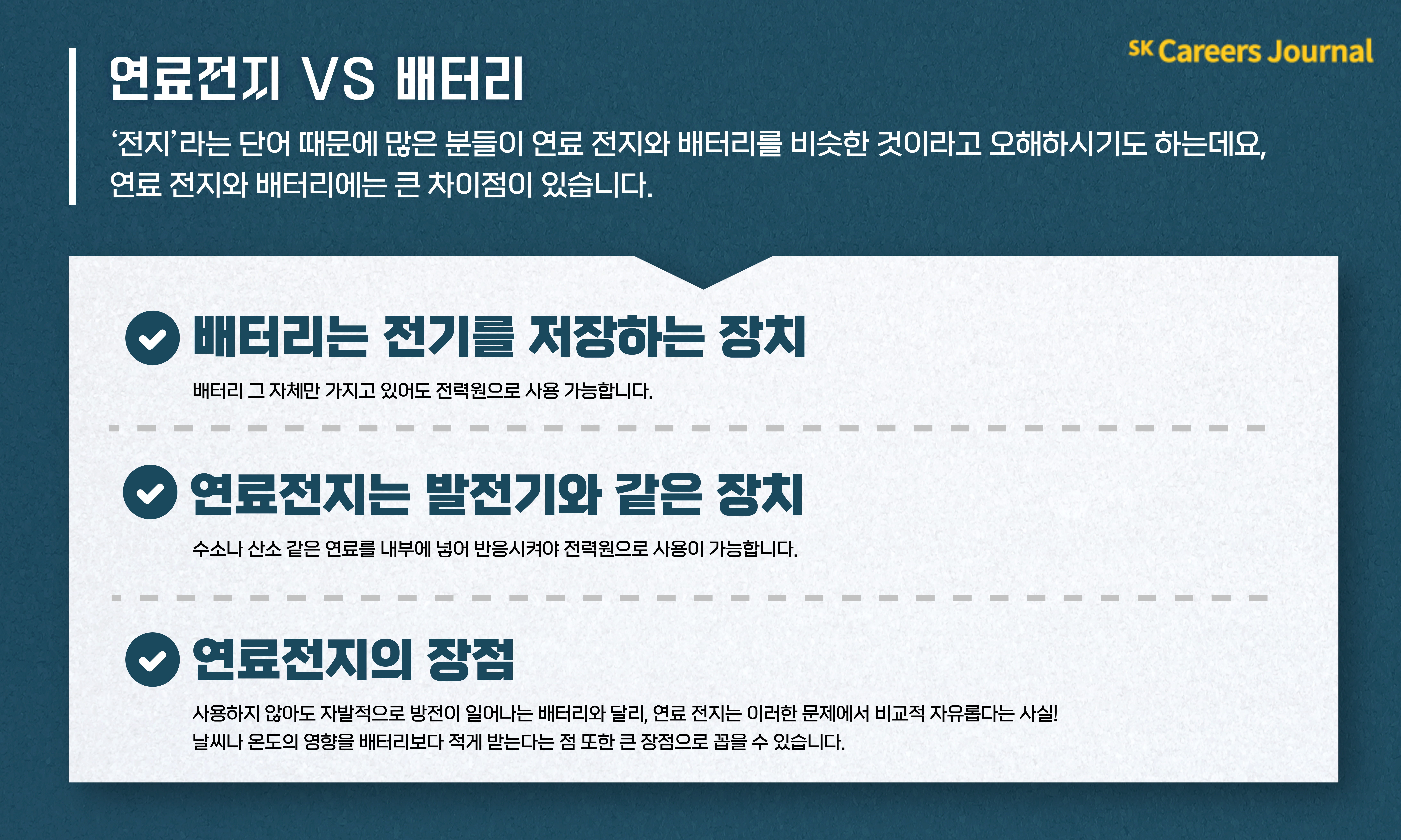 ‘연료 전지’라는 용어에서, ‘전지’라는 단어 때문에 많은 분들이 연료 전지와 배터리를 비슷한 것이라고 오해하시기도 합니다. 그러나 연료 전지와 배터리는 큰 차이가 있는데요, 우선 배터리는 전기를 저장하는 장치입니다. 그 자체만 가지고 있어도 전력원으로 사용 가능합니다. 그러나 연료 전지는 전기를 만들어내는 발전기와 같은 장치로, 수소나 산소 같은 연료를 내부에 넣어 반응시켜야 전력원으로서 사용이 가능하다는 점에서 배터리와는 큰 차이가 있습니다. 아울러 연료 전지는 배터리와 비교하여 많은 장점들을 갖고 있는데요, 사용하지 않아도 자발적으로 방전이 일어나는 배터리와 달리, 연료 전지는 이러한 문제에서 비교적 자유롭습니다. 이 외에도 날씨나 온도의 영향을 배터리보다 적게 받는다는 점 또한 큰 장점으로 꼽을 수 있습니다.