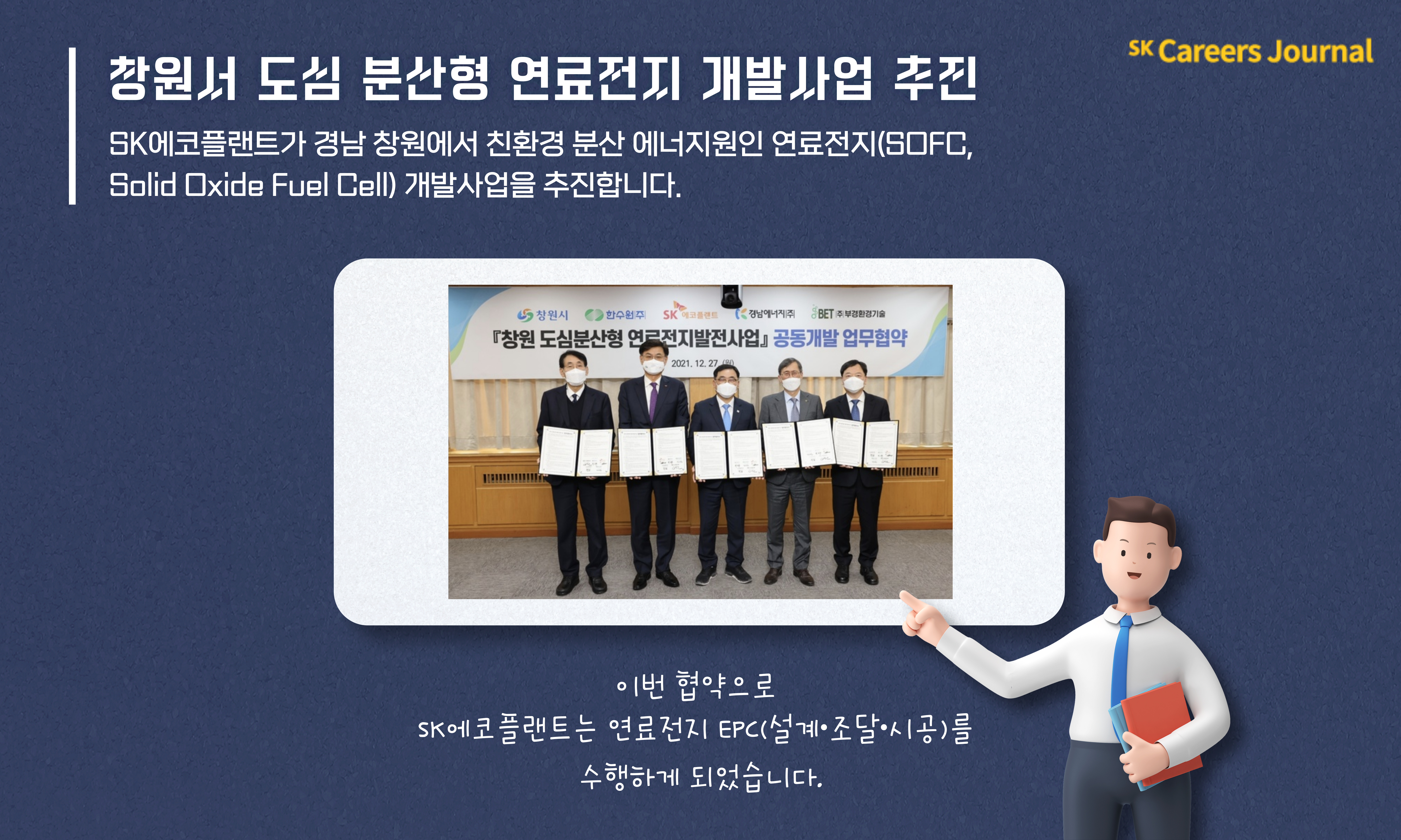SK에코플랜트는 지난 21년 12월, 창원 시청에서 창원시, 한국수력원자력, 경남에너지, 부경환경기술과 ‘창원 도심 분산형 연료전지사업 공동개발협약(JDA)’을 체결했습니다. 이번 협약으로 SK에코플랜트는 연료전지 EPC(설계∙조달∙시공)를 수행하게 되었습니다.