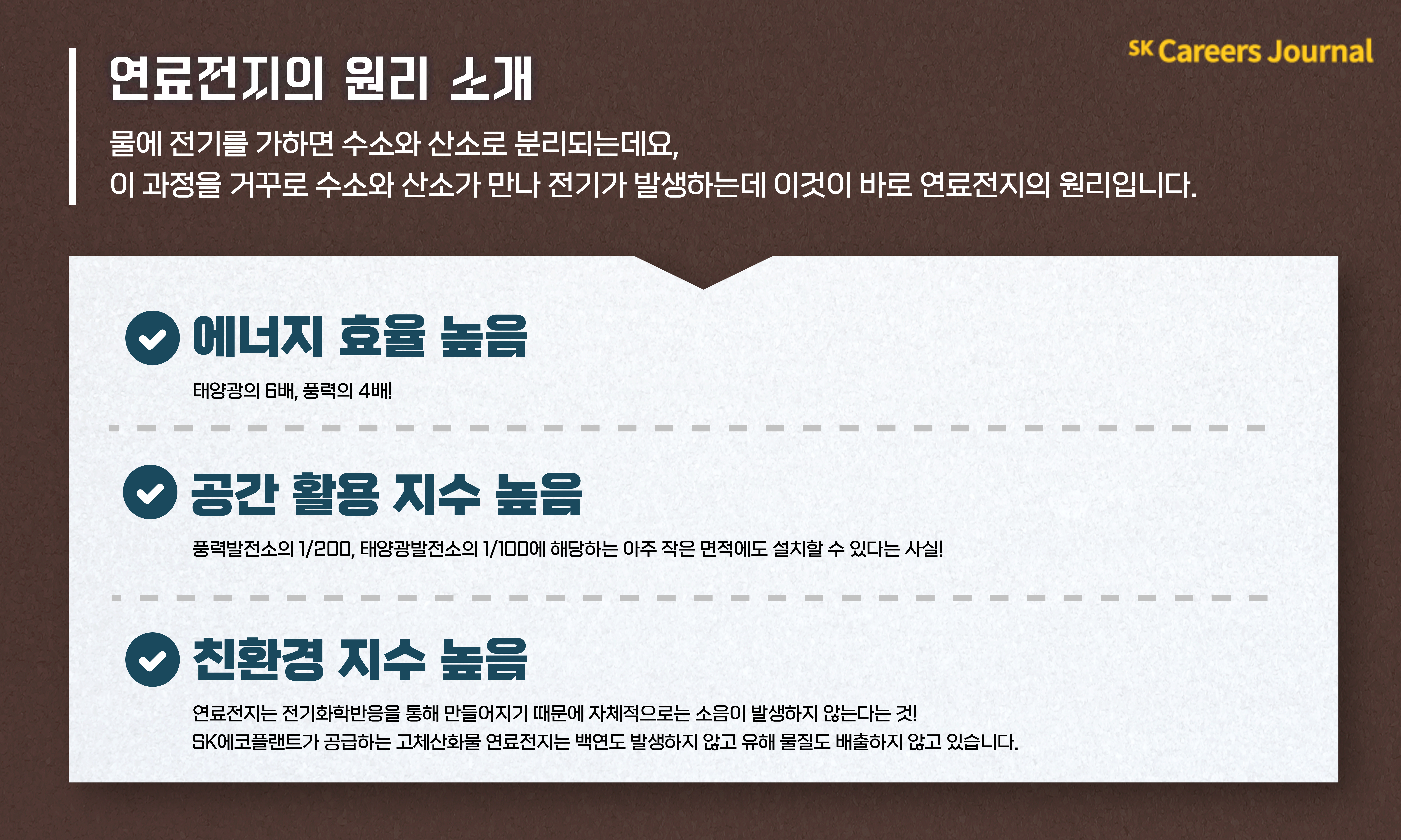 또한, 연료전지는 에너지 효율, 공간 활용 지수, 친환경 지수가 높습니다. 에너지 효율은 태양광의 6배, 풍력의 4배입니다. 공간 활용에 있어서는 풍력발전소의 1/200, 태양광발전소의 1/100에 해당하는 아주 작은 면적에도 설치가 가능하기 때문에 큰 장점이라고 볼 수 있습니다. 마지막으로 연료전지는 전기화학반응을 통해 만들어지기 때문에 자체적으로는 소음이 발생하지 않습니다. SK에코플랜트가 공급하는 고체산화물 연료전지는 백연도 발생하지 않고 유해 물질도 배출하지 않고 있습니다.