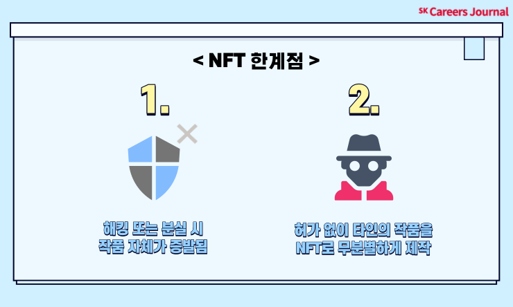 가장 큰 문제는 블록체인 자체가 해킹되거나 디지털 개인 지갑 및 주소를 분실하게 되면 작품 자체가 증발해버립니다. 이것이 현재 가장 큰 문제점 중 하나입니다. 또한 NFT 시장이 점점 커지면서 실제로 작품을 만든 사람들의 허가를 받지 않고 타인의 작품을 마음대로 NFT로 제작하는 문제가 있습니다.