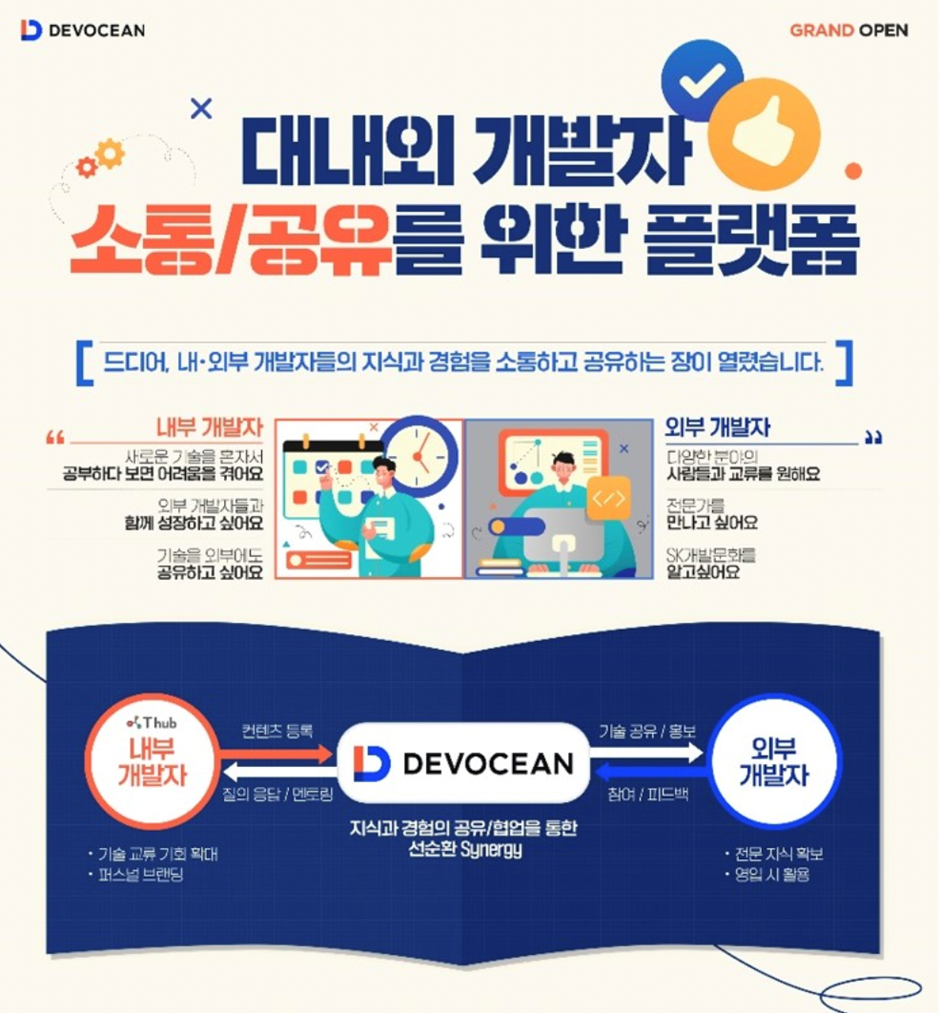 DEVOCEAN은 2021년 5월 31일 SK 관계사 개발자 커뮤니티로 시작한 T hub에서 대내외 개발자들의 소통 공간으로 탈바꿈하여 새롭게 출범하였습니다. 시시각각 변화하고 있는 기술들을 혼자 공부한다면 많은 어려움이 생기실 겁니다. 또한 기술에 대한 자신의 생각을 누군가와 공유하며 발전시켜야 하는 순간이 오기도 하고요. DEVOCEAN은 이와 같은 고민을 가진 개발자들을 돕고자 합니다. 게다가 직무에 대한 궁금증을 가지고 있는 취준생을 위해서 SK 관계사에서 현재 개발자로 근무하고 계시는 분들에게 멘토링을 구하는 공간까지 마련되어 있습니다. 이런 공간이 어떻게 만들어졌고 어떤 도움을 받을 수 있는지 알아보고자 DEVOCEAN 운영자님을 인터뷰했습니다. 홀로 고민하지 말고 전문가들과 소통하며 자신의 기술을 갈고닦고자 한다면 지식의 바다 ‘DEVOCEAN’으로 와주세요!