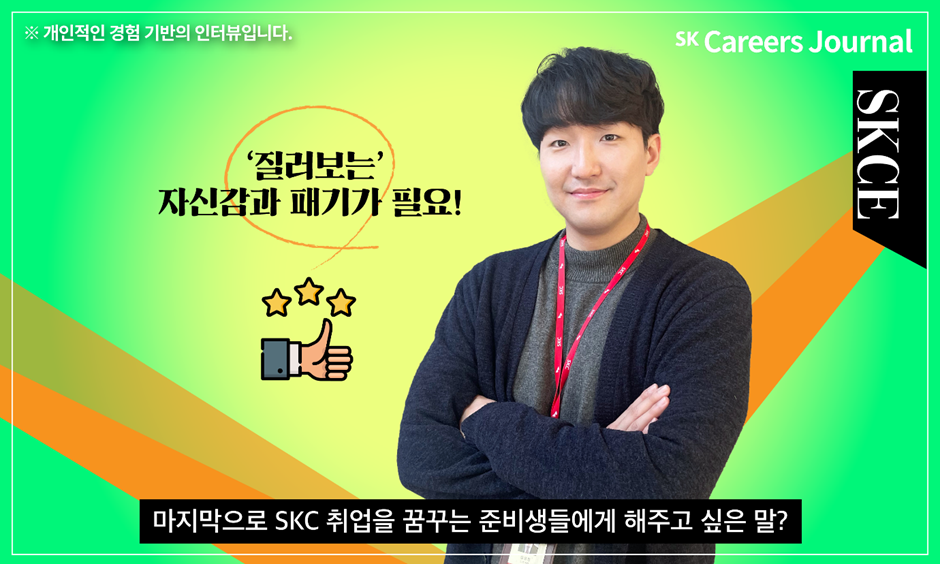 산업에 대한 전문 지식을 공부한다고 해도 취업 전에 접근할 수 있는 정보는 제한적이기 때문에, 지식의 유무가 취업의 당락을 좌우하는 것 같지는 않습니다. 오히려 그 지식이 빛을 발하는 건 취업 후라고 생각합니다. 특히나 SKC의 주력 분야가 문과 전공자에게는 생소한 화학분야의 제조업이다보니 산업의 흐름을 따라가기 위해 취업 후에도 끊임없는 자기계발과 공부가 필요하다는 것을 일하면서 매일같이 몸소 느낍니다.