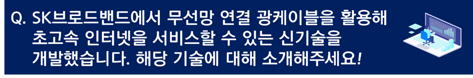 SK브로드밴드가 무선망 연결 광케이블을 활용해 초고속 인터넷을 서비스할 수 있는 신기술을 개발했습니다! 이를 계기로 자체 인프라 설비 구축이 어려운 지역에도 초고속 인터넷 서비스를 제공할 수 있다고 하는데요. 앞으로 초고속 인터넷 서비스 제공 가능 지역이 더 확대될 수 있을 것으로 보입니다. 정소기 매니저님과 함께 많은 이의 초고속 인터넷 생활을 실현시킬 이번 신기술, 그리고 R&BD 직무까지 알아봤습니다.