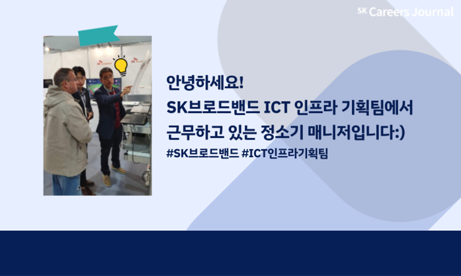 안녕하세요! SK브로드밴드 ICT 인프라 기획팀에서 근무하고 있는 정소기 매니저입니다. 저는 현재 저희 본부에서 진행 중인 R&D 관련 업무, 국가와의 협업을 통해 수행하는 과제 등을 총괄하는 업무를 맡고 있습니다.