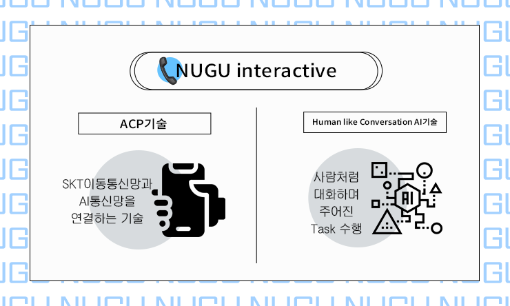 NUGU interactive는 '전화의 지능화'를 위한 핵심 요소 기술로 SKT 이동 통신망과 AI 플랫폼을 연동하는 ACP 기술, 그리고 사람처럼 대화하면서 주어진 Task를 수행하는 Human Like Conversational AI 기술로 구성되어 있습니다. ACP 기술은 통신망과 AI 플랫폼이 연동되었기 때문에 누구나 전화만 가지고 있으면 AI 서비스 제공이 가능해졌다는 것을 의미하고, Human Like Conversational AI 기술은 기계가 사람처럼 이야기하고 알아듣고 대화가 가능해졌다는 것을 의미합니다. 즉 2가지가 통합된 NUGU interactive 기술을 이용하면 '전화를 가진 누구에게나 자연스러운 대화 시나리오를 적용한 AI 서비스 제공'이 가능해진 것이라 볼 수 있습니다.