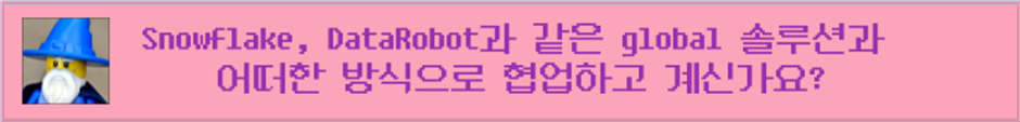 Q. DataLake로 유명한 Snowflake, 데이터 분석 모델링(AutoML)로 유명한 DataRobot과 같은 global 솔루션과 어떠한 방식으로 협업하고 계신가요?