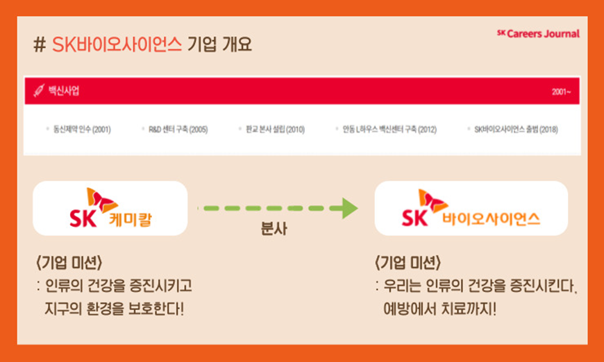 SK바이오사이언스의 모기업인 SK케미칼은, 1969년에 출범한 이래로 국내의 화학 및 생명과학 분야의 변화와 혁신을 이끌어온 기업입니다. <인류의 건강을 증진시키고 지구의 환경을 보호한다>는 미션을 정립하여 Green Chemicals 사업부문과 Life Science 사업부문, 이렇게 두 가지 분야로 사업구조를 재편하였고, 이러한 흐름 속에서 2001년에 동신제약을 인수하면서 백신사업이 본격적으로 시작되었습니다. 그 후에는 2005년에 백신 연구 및 개발을 담당하는 R&D 센터를 구축하였고, 2012년에는 안동에 L하우스 백신센터를 구축하며 성장 기반을 마련하였습니다. 이후 2018년에 SK바이오사이언스가 SK케미칼로부터 분사되어 정식 출범하게 되었답니다!