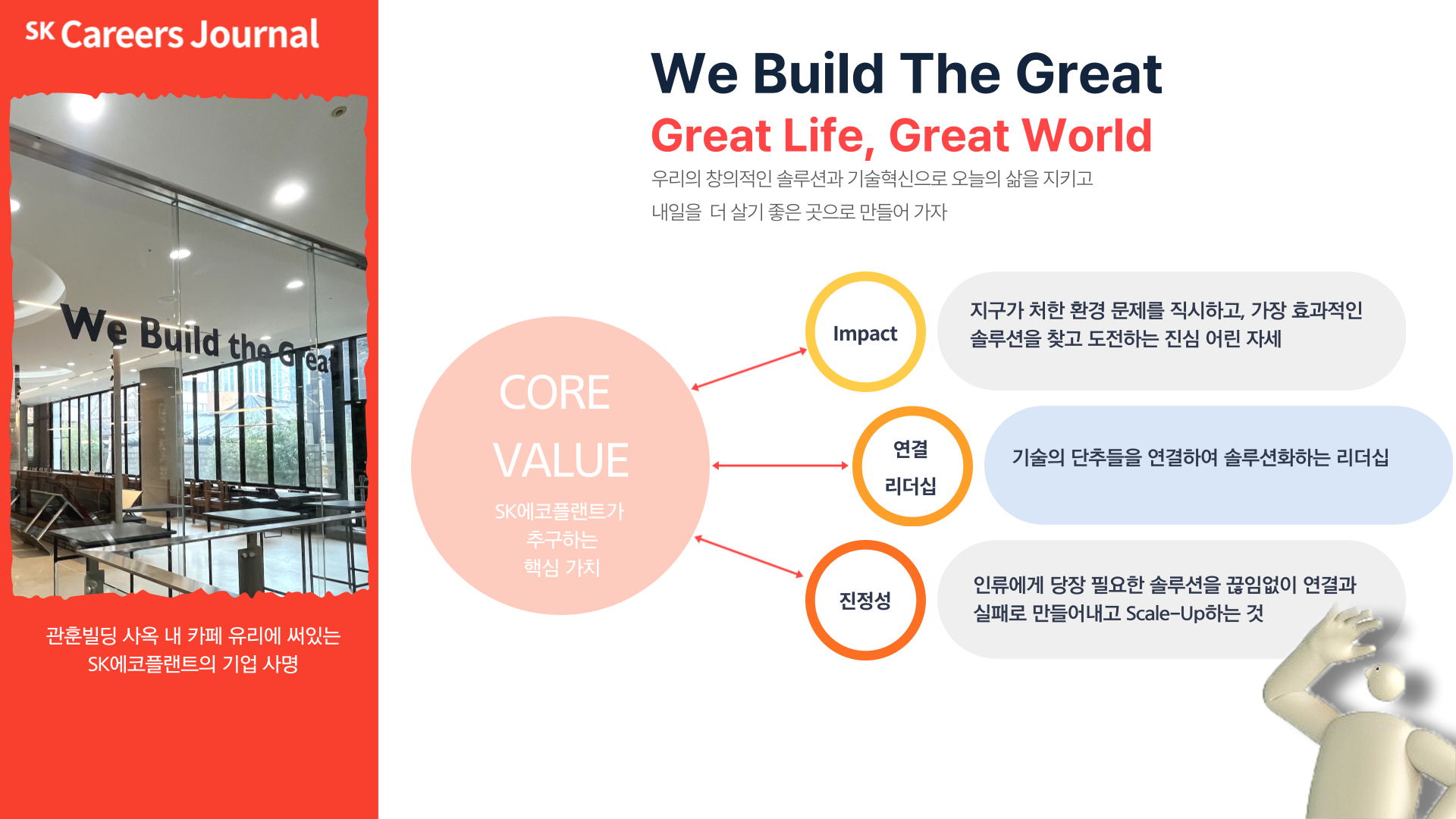 그전에 두가지를 알려줄 것이 있어. 첫번쨰로 SK에코플랜트의 Corporate Mission 즉, 기업사명이야. ‘We Build The Great’으로 SK에코플랜트는 기술을 매개로 환경과 사람,금융을 잇는 친환경 생태계 플랫폼으로 비즈니스 모델을 정의하고 있어. 오늘의 문제를 해결하고 보다 나은 내일을 위해, 창의적 솔루션과 선도적 기술로 지속가능한 삶을 건설하겠다는 포부를 가지고 있지. 두번째로는 SK에코플랜트의Core Value, 즉, 핵심가치야. 진정성, 연결리더십 그리고 Impact로 등 3가지로 볼 수 있어. 이게 무슨 말일까 싶지? 오늘 나는 SK에코플랜트 사옥 곳곳에 숨겨져 있는 핵심가치들을 보여주려해.